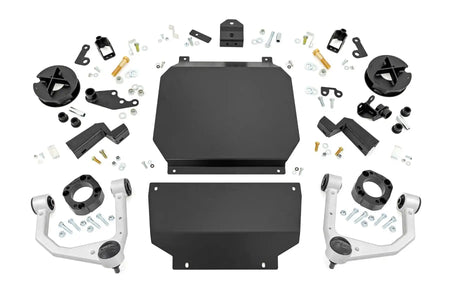 Give your Toyota Tundra 4WD (2022-) a powerful lift in both appearance and ground clearance with Rough Country's 3.5" (approx. 8.9 cm) lift kit. The factory-set front end's downward slope is a well-known problem - but with this kit you not only get a level-adjusted stance but also the ability to mount larger tires. The result? A vehicle that both performs and is seen.