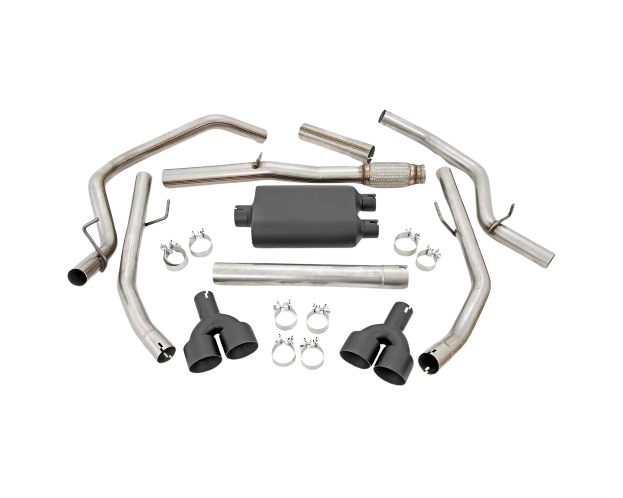 Each kit features a set of high-temp resistant, dual-wall 304 black stainless tips with RC logo for an improved, aggressive look. Upgrading your exhaust note has never been easier! Each kit conveniently installs onto the factory hangers and features stainless clamps for easy assembly with no welding required!