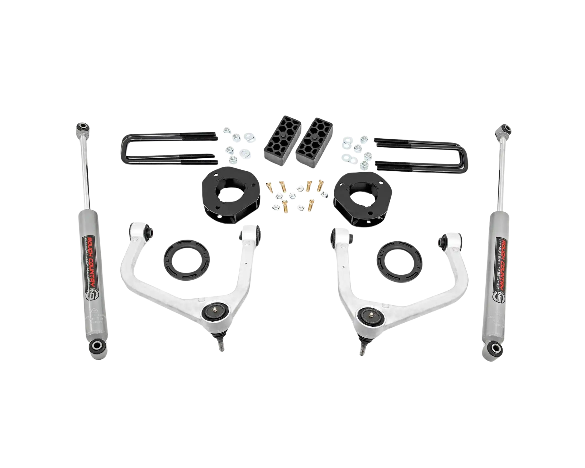 This kit also features upgraded ball joints that are easy to install and maintenance free. These POM ball joints offer a greater range of motion for more wheel articulation than standard or OE replacements and feature a Polyoxymethylene ball race with an extremely low coefficient of friction for longer life, and a larger ball diameter to improve range of motion with a maintenance free design. Also included in this kit are a set of fabricated rear blocks. Fabricated blocks are stronger and offer a longer lifespan than cast blocks while being less susceptible to damage and the environment.