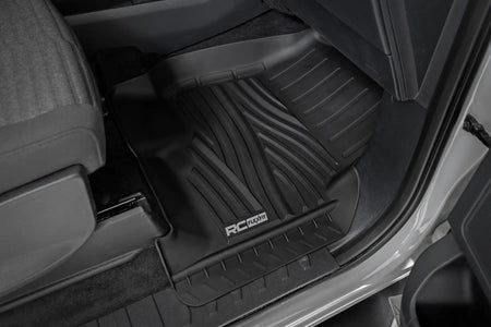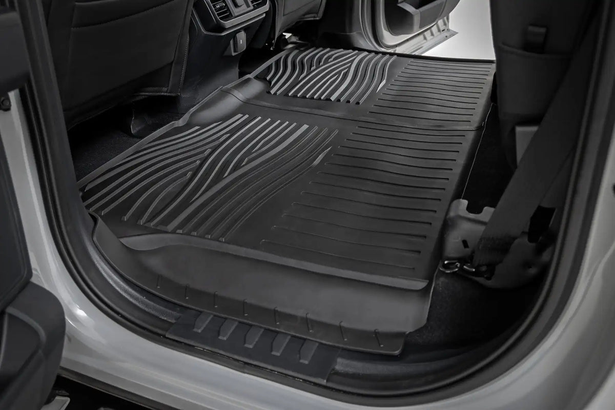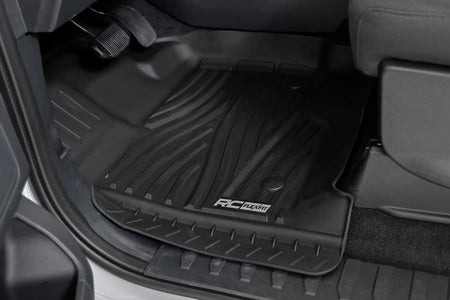 Upgrade to Rough Country's Flex-Fit Floor Mats for ultimate all-weather protection on your adventures. Engineered with laser measuring technology to fit perfectly, these mats defend against snow, mud, spills, and more with a spill-saver lip and non-slip surface. Made of premium rubber-like TPE material, they are soft, flexible, and highly durable.