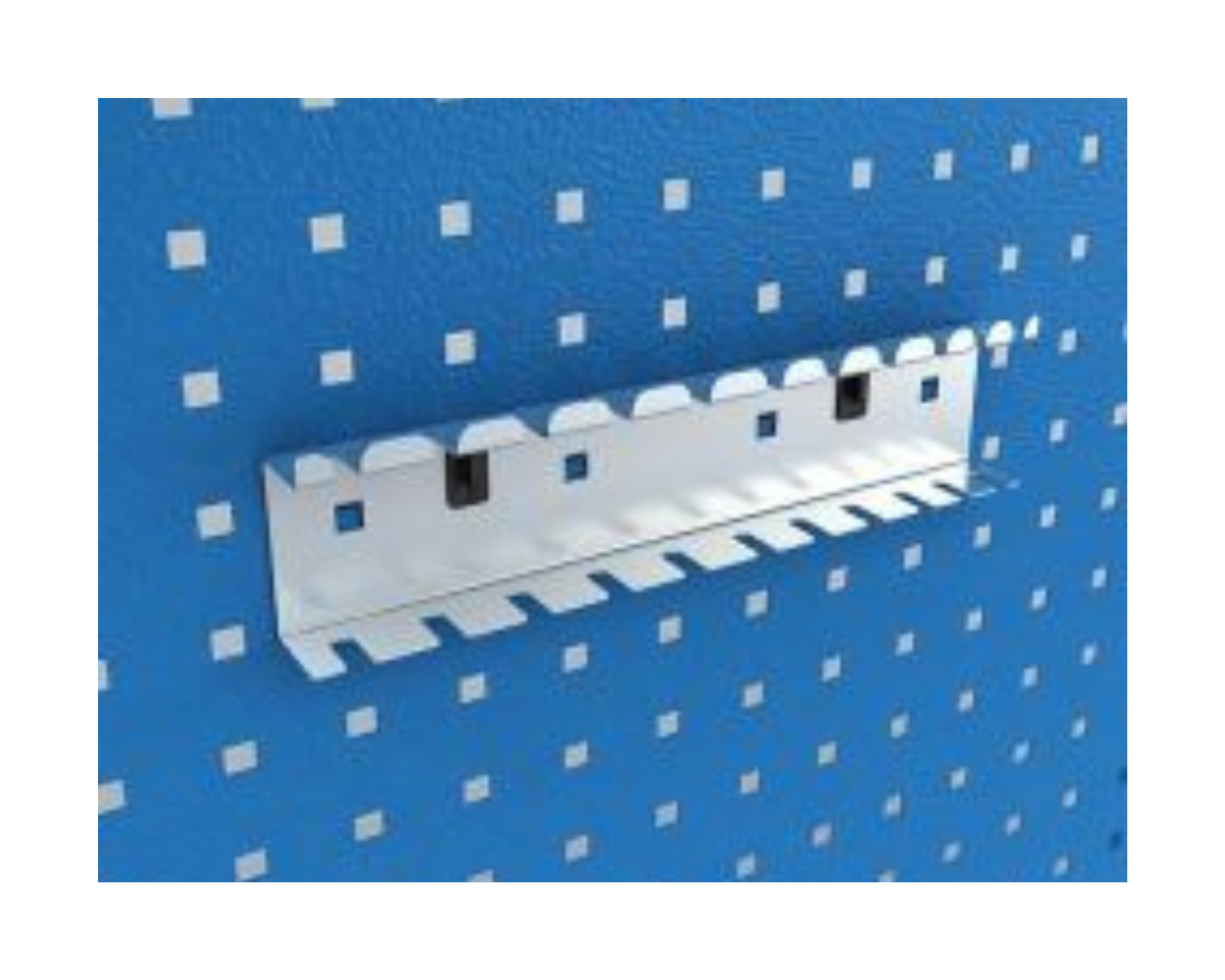 Skruvmejselhållare artikelnummer FS 361655. Hållaren har plats för 11 stycken skruvmejslar i olika storlekar och går att fästa i perforerad plåt, exempelvis i någon av våra arbetsbänkar eller verkstadsinredning utrustad med verktygstavla.
