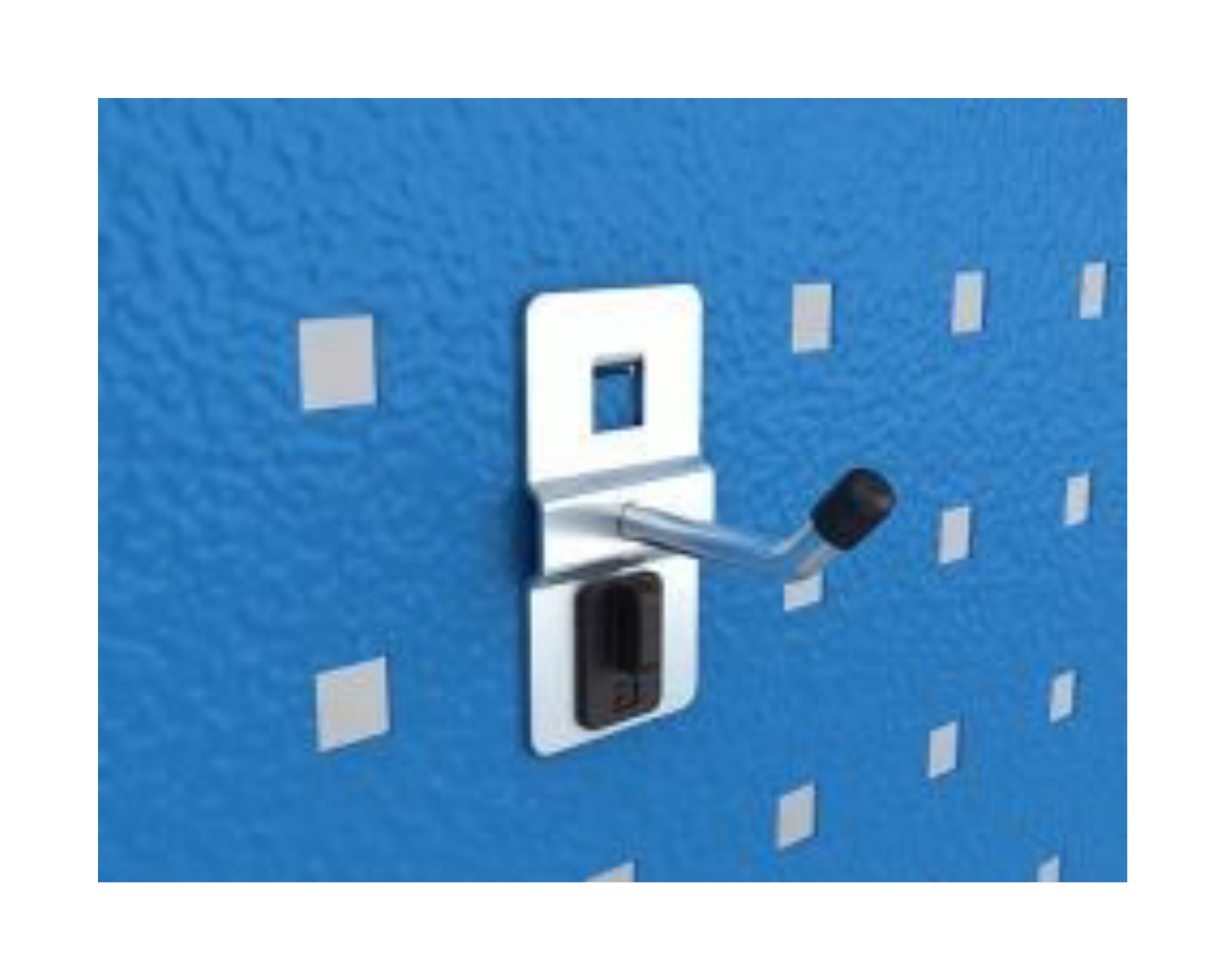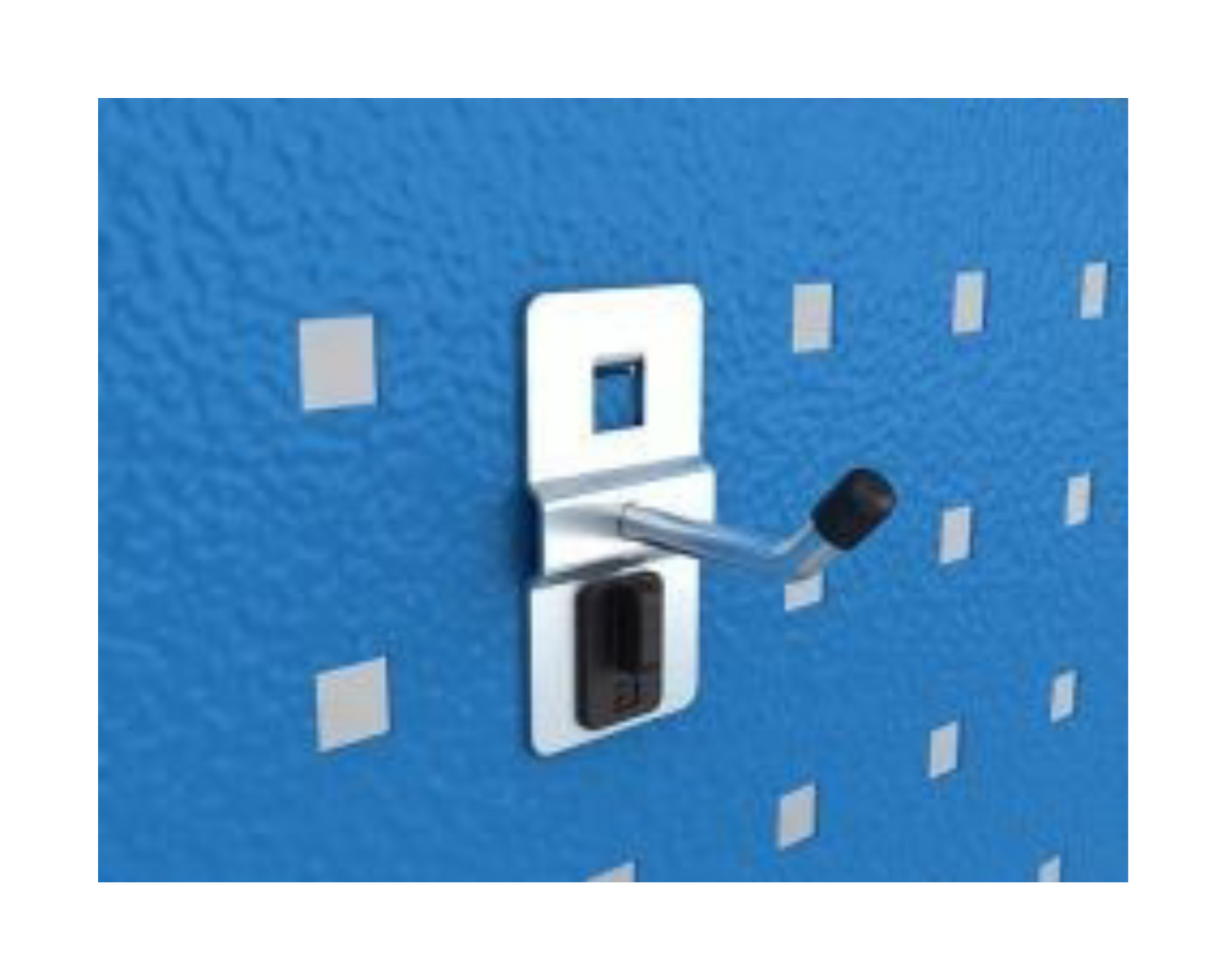 Enkelkrok med artikelnummer FS 361656 att fästa i perforerad plåt, exempelvis i någon av våra arbetsbänkar eller verkstadsinredning utrustad med verktygstavla.