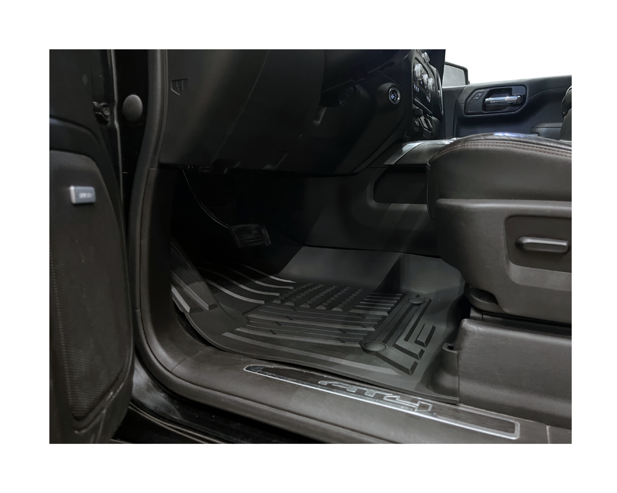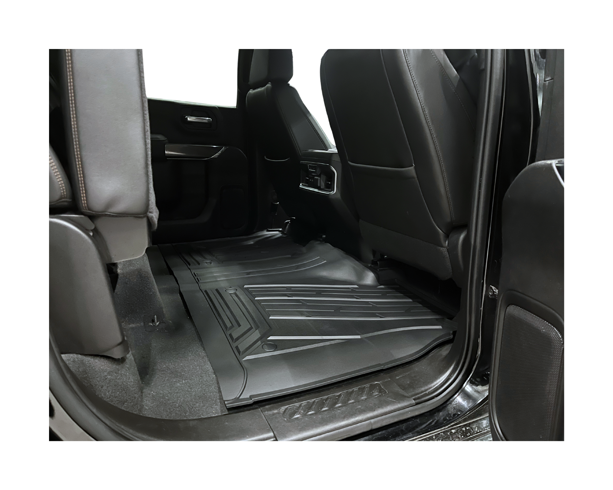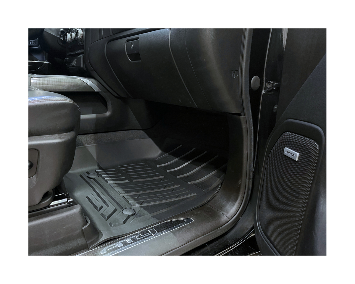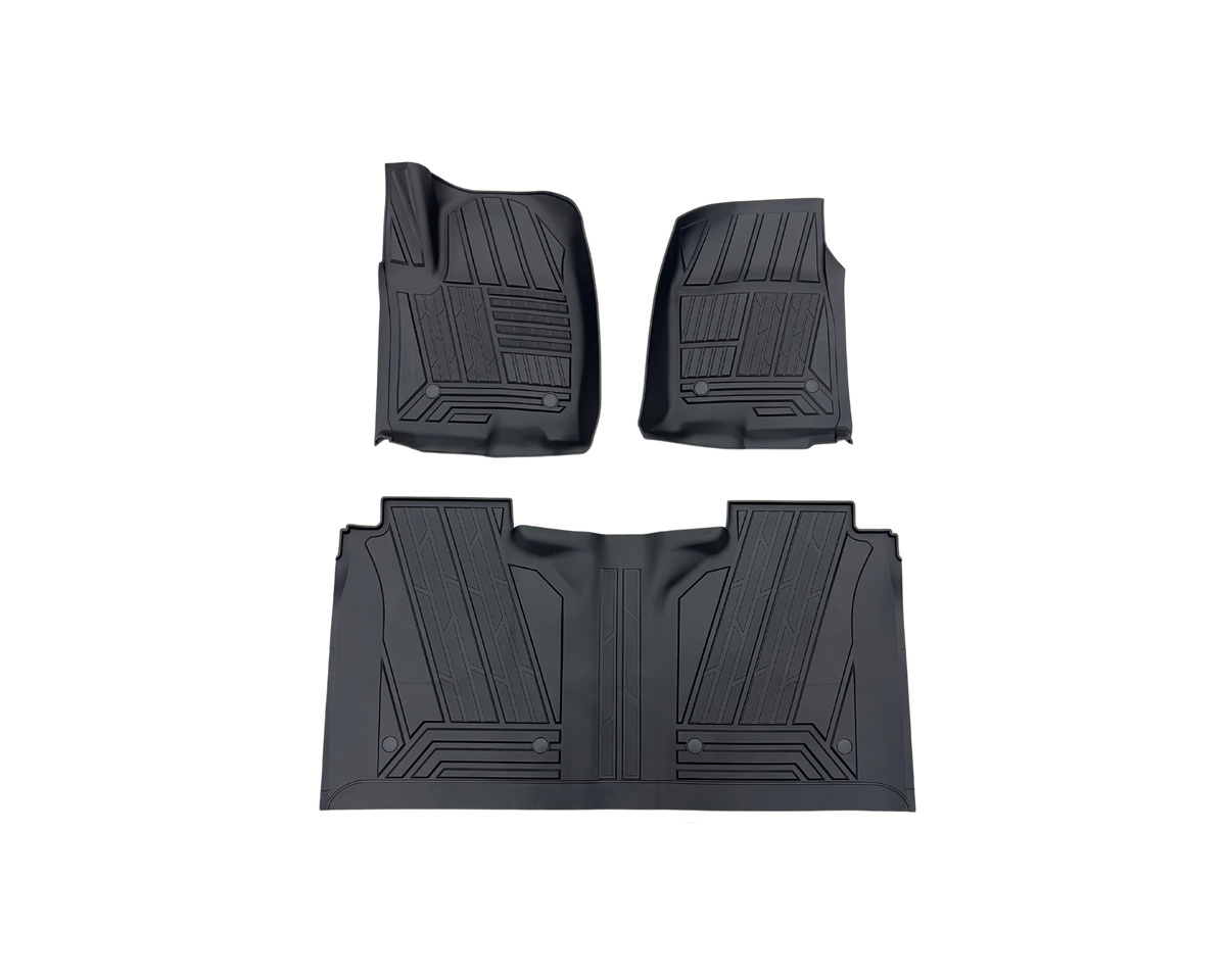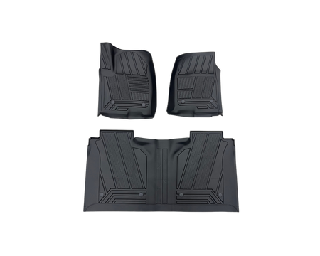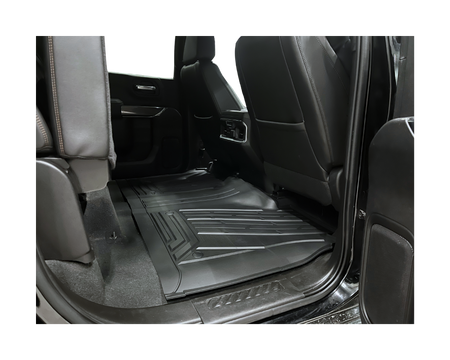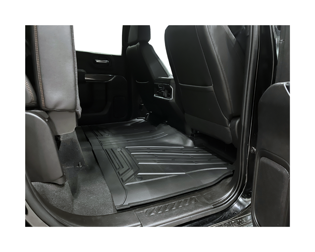Komplett kit med främre och bakre gummimattor med artikelnummer MT-FM-10130B från Mad Truck Accessories. Mattorna är tillverkade i slitstarkt termoplastiskt gummi och passar Chevrolet Silverado & GMC Sierra med sätesförvaring baktill.