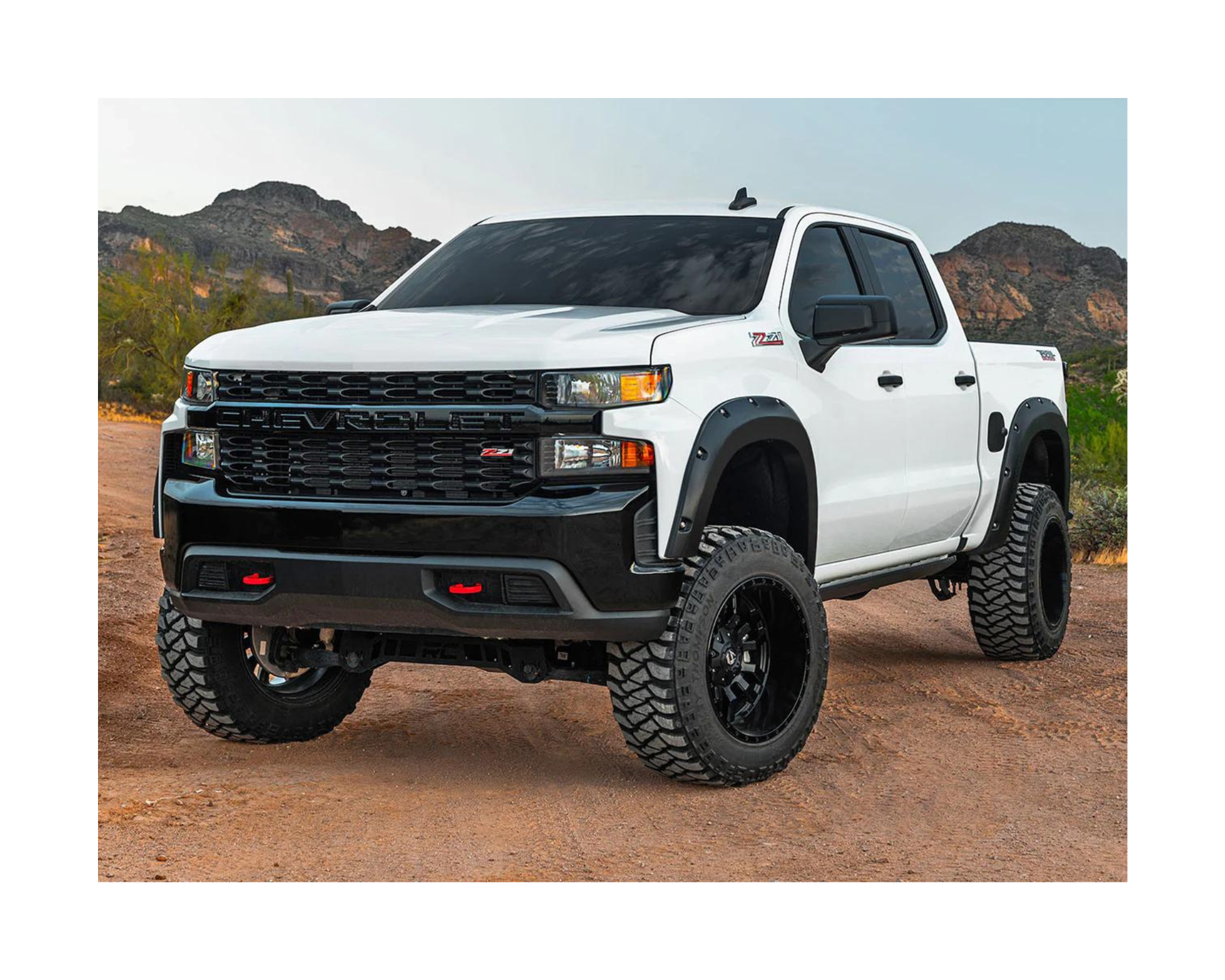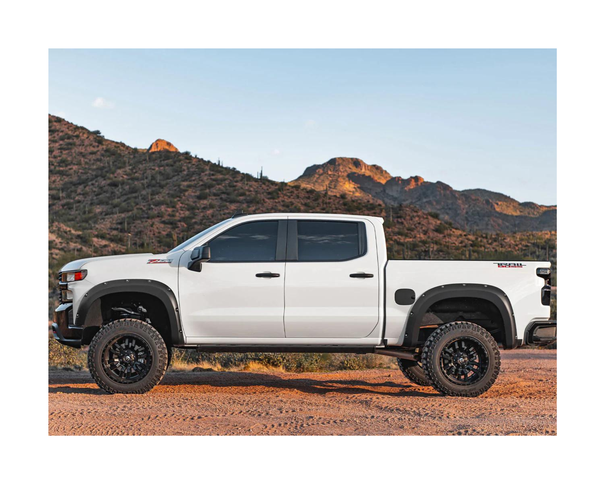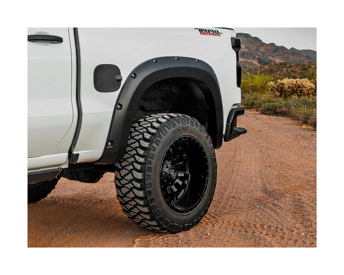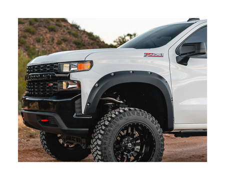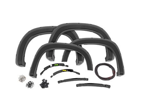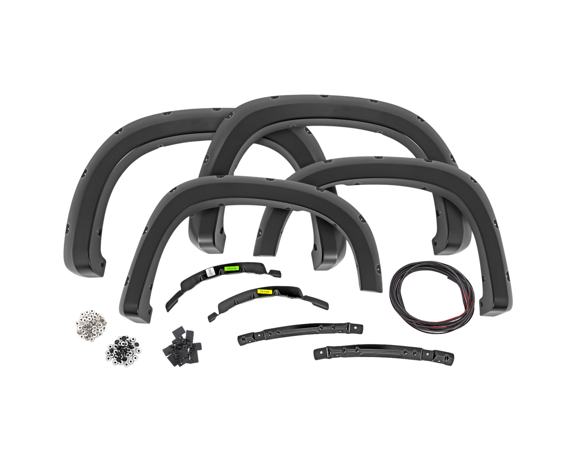 Add aggressive good looks quickly and easily with Rough Country's Fender Flares. Nothing compliments a new lift, wheels, and tires like a set of stylish, mean-looking fender flares. Rough Country's Fender Flares are designed with a simulated riveted look. These fender accessories bolt-on quickly and easily in a few secure mounting points, making installation a cinch. No cutting or drilling is required to install, and these flares can be easily removed and return your truck to stock! These UV treated fender flares ship in flat-black or can easily be painted to match your vehicle, and are designed to withstand the sun, rain and other elements of nature.