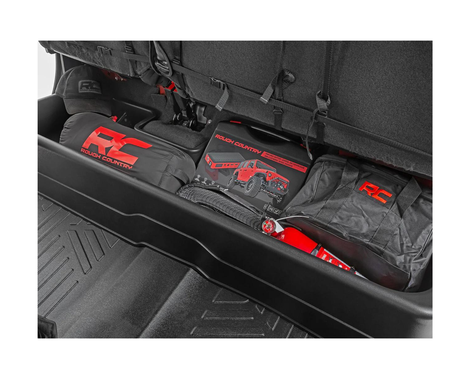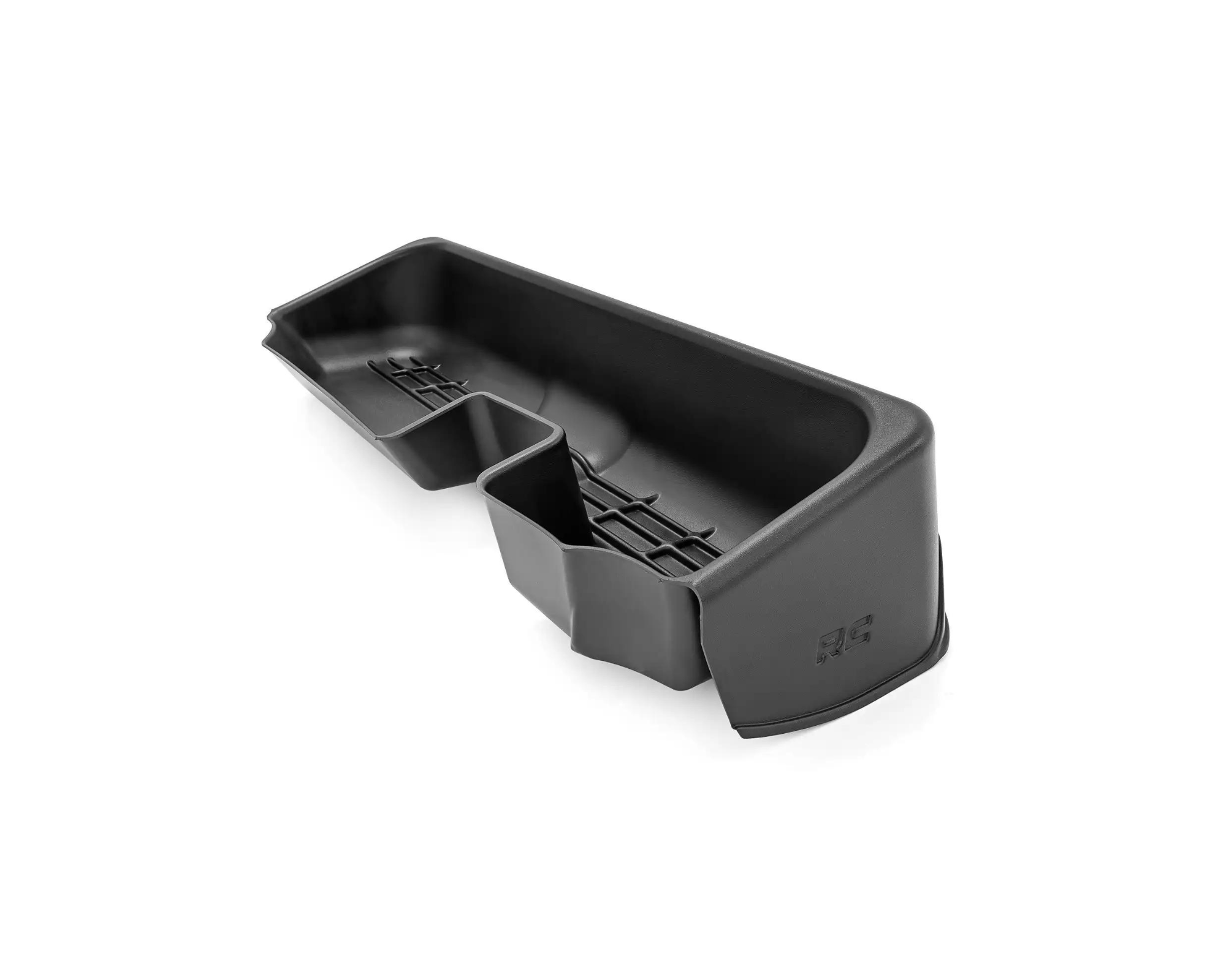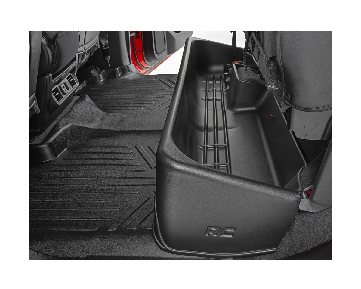 Each under seat storage tray is constructed from a durable, high-density thermoplastic material that’s built to withstand kicks, nicks, and corrosion. A convenient anti-skid surface helps prevent the contents of your under seat cargo tray from rolling around while driving. Best of all, Rough Country’s Custom-Fit Under Seat Storage Compartments are easy to install, so you can upgrade your cargo management quickly and easily!
