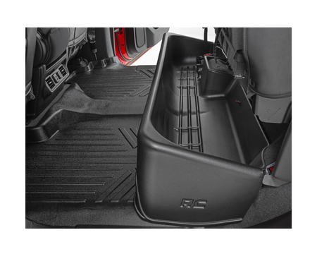 Clean up the contents of your cab with Rough Country’s Custom-Fit Under Seat Storage Compartment. These handy under seat truck storage compartments offer an easy way to store your gear with a custom, contoured look that blends in seamlessly with your vehicle’s factory design. Keep your tools, gear, and other odds and ends organized and stowed away while conveniently stowed away under the rear seats.